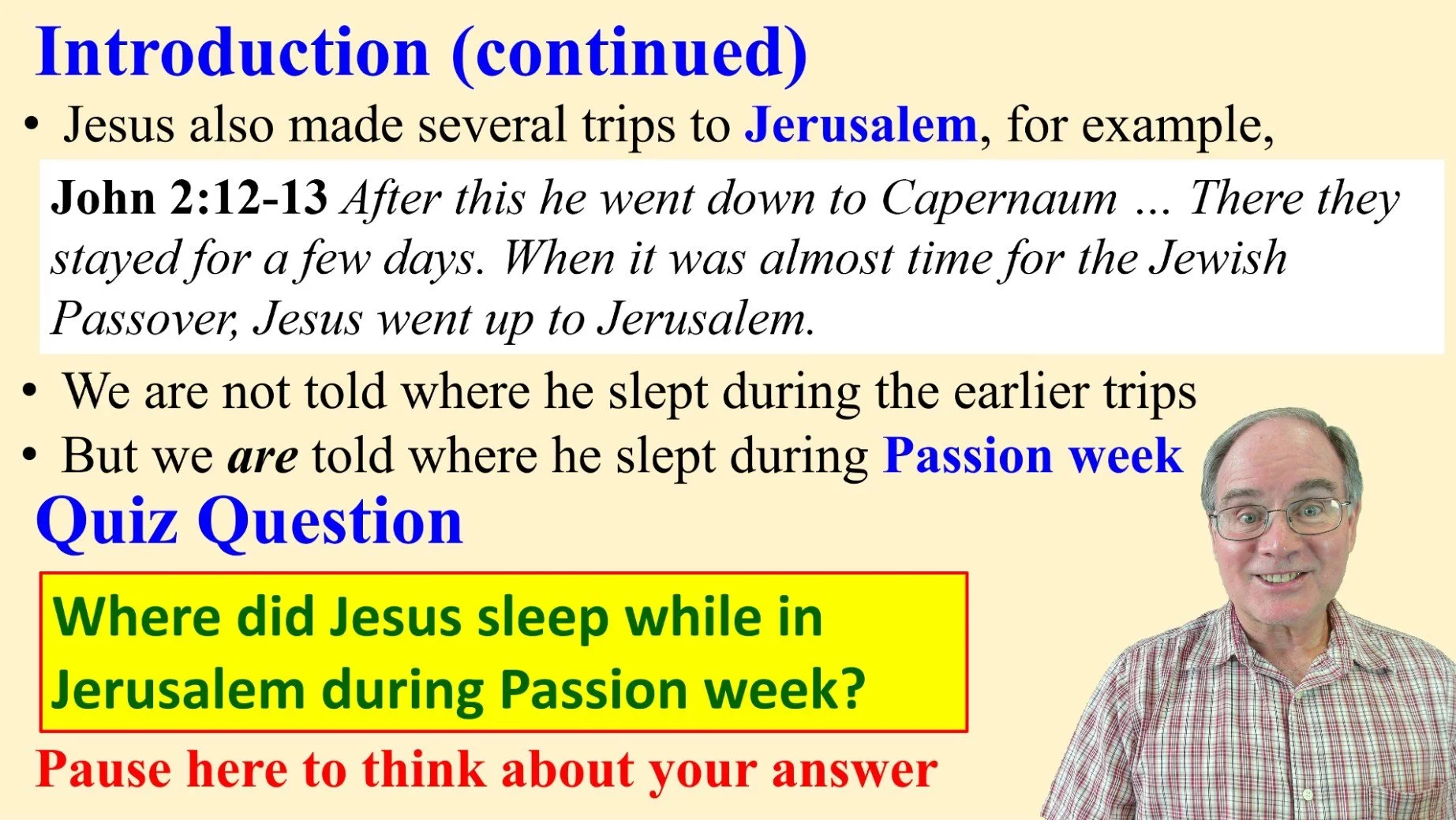 In this 2.5-minute Bible quiz video, John Cimbala carefully examines the scriptures to answer this question: Where did Jesus sleep while in Jerusalem during Passion week? We find that although Jesus' home base was Capernaum in Galilee, there were two places where he slept while in Jerusalem. https://youtu.be/hrz-cLbvRnE