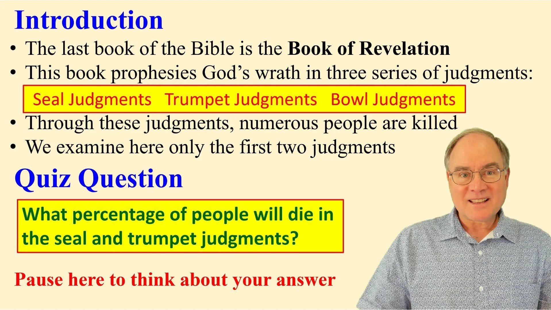 In this Minute Bible Quiz, John Cimbala asks how many people are killed by God's wrath during the first of the three major judgments in the book of Revelation - the seal and trumpet judgments (not even counting the bowl judgments which come later). The answer may surprise you!