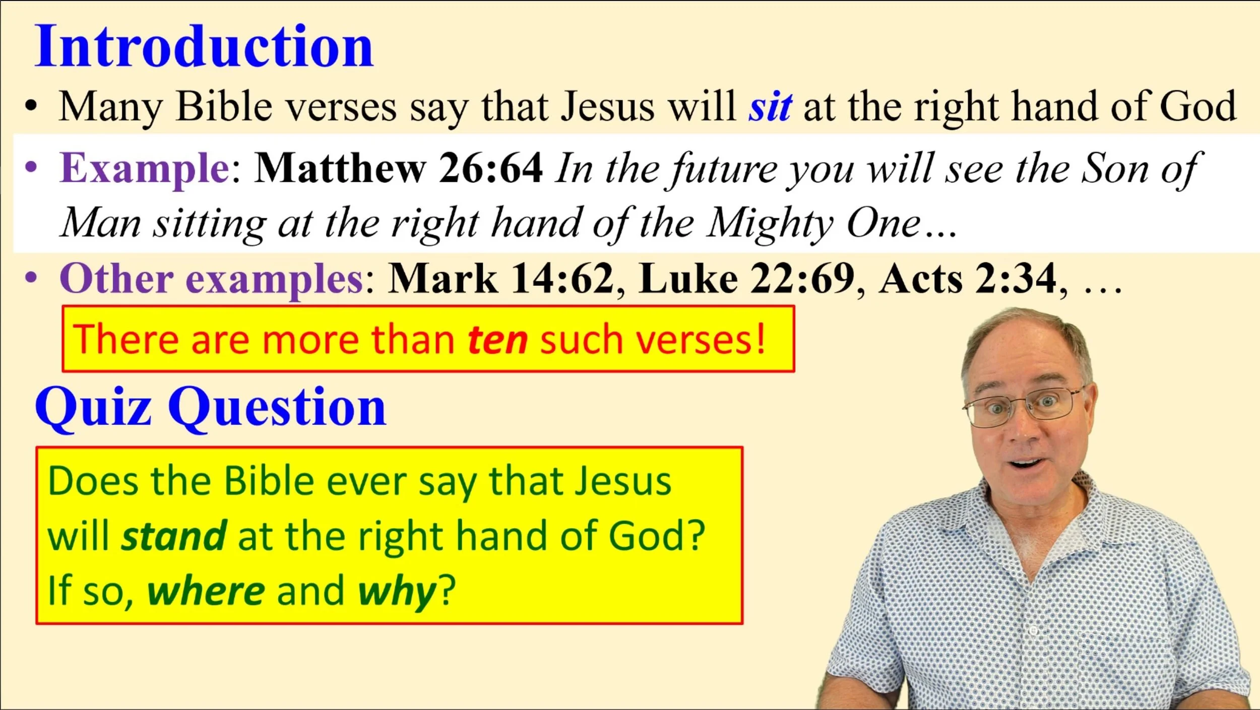 Many Bible verses mention Jesus SITTING at the right hand of God after his ascension. But is there any verse that says that Jesus will STAND at God's right hand? In this 2.5-minute Bible quiz video, John Cimbala carefully examines the scriptures to answer this question.