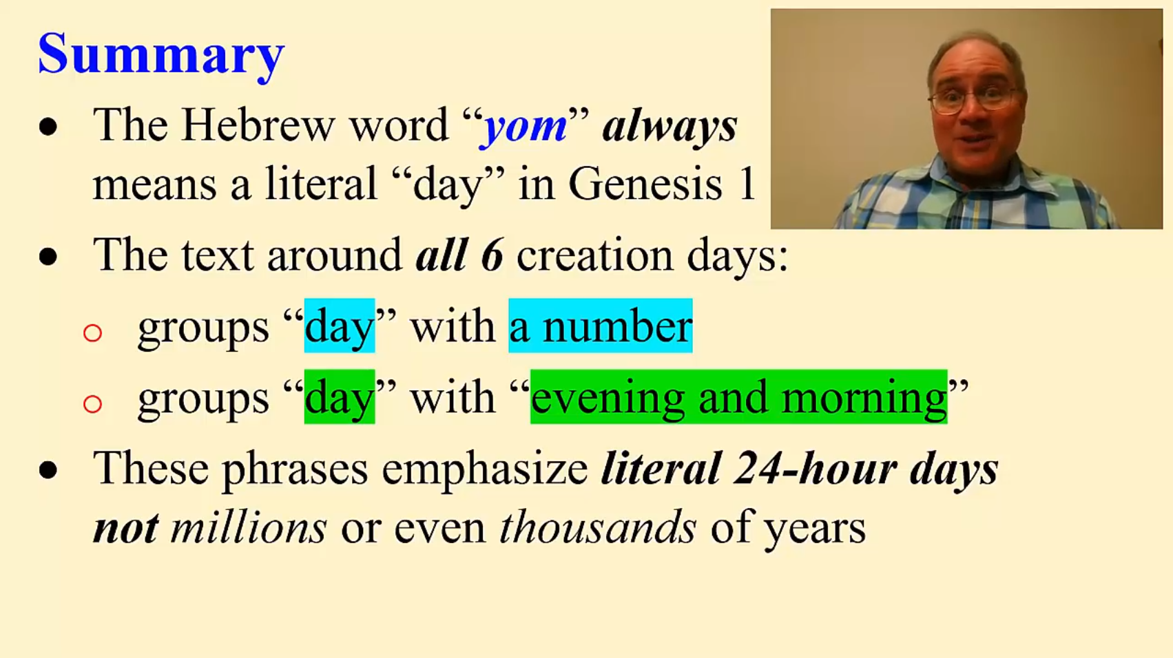 In this Two-Minute Bible Video, we examine the text of Genesis 1 to answer the question: Are the days of Genesis literal 24-hour days? The word "day" (Hebrew word "yom") is always grouped with "evening and morning" and with a number (first, second, ...). Either of these groupings implies a literal 24-hour day, not long periods of time.